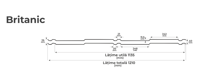 Țigla metalică Britanic poate fi livrată cu lungimi cuprinse între 500 mm și 4500 mm.